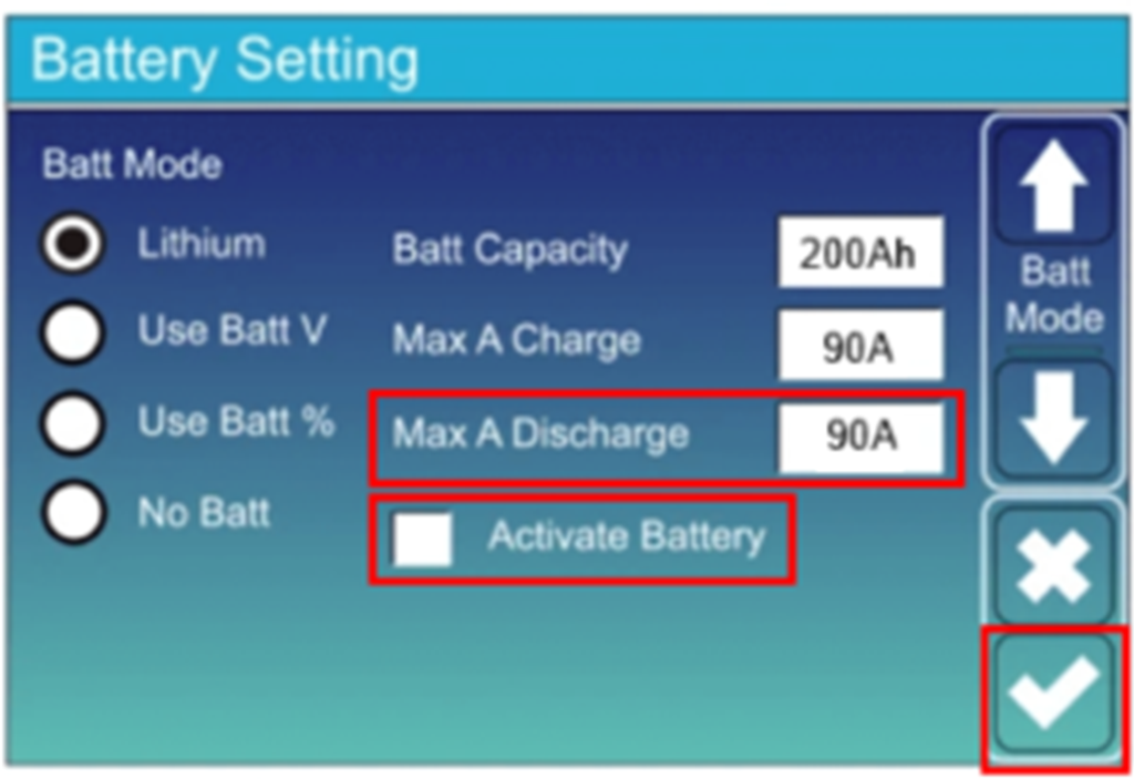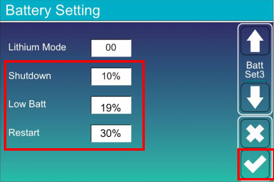 V nastavení střídače je nutné povolit dobíjení baterie z distribuční soustavy a dále správně nastavit mezní hodnoty SOC pro stavy LOW BATT 19% (střídač zobrazí varování o nízkém stavu baterie), SHUTDOWN 10% (střídač se vypne), RESTART 30% (střídač začne opět dodávat energii), dále doporučujeme nastavit hodnotu vybíjecího proudu v rozmezí 30-60A a v neposlední řadě zkontrolovat odškrtnutí políčka ACTIVATE BATERY (nesmí být zaškrtnuté). Veškerá nastavení provádějte vždy pečlivě s rozmyslem pomocí dotykové obrazovky a navigačních šipek. Pro potvrzení změn je nutné použít fajfku vpravo dole.