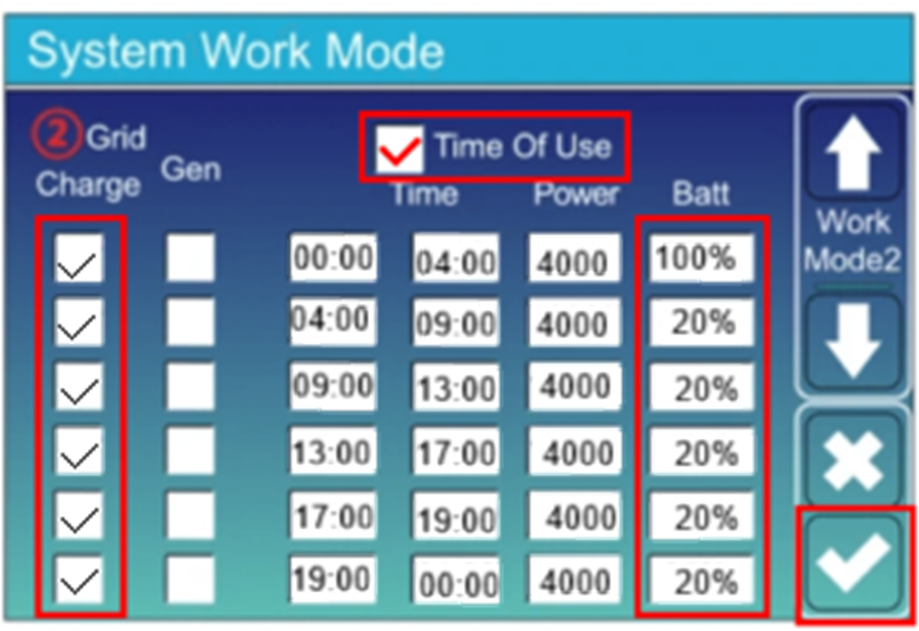 3. Na obrazovce SYSTEM WORK MODE vidíme jednotlivé časové úseky dne. V první řadě zaškrtneme políčko Time Of Use, tím dojde k aktivaci časového plánu.