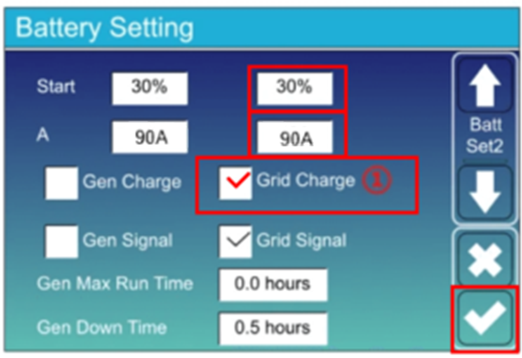 2. Na další obrazovce povolíme nabíjení baterie ze sítě (GRID CHARGE) a stanovíme kapacitu, kdy má k nabíjení ze sítě docházet (START = 30 %) a jakým nabíjecím proudem (V = 90 A). Nastavení na závěr potvrdíme fajfkou.